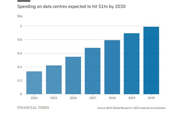 Entonces, ¿es el gran sector de la IA una gran burbuja, financiada por capital ficticio que no se materializará con los ingresos y, lo que es más importante, los beneficios para los líderes de IA? A finales de este año, Meta, Amazon, Microsoft, Google y Tesla habrán gastado más de 560 mil millones de dólares en inversión de capital en IA en los últimos dos años, pero solo han acumulado ingresos por unos 35 mil millones de dólares. Amazon planea gastar 105 mil millones de dólares en inversión de capital este año, pero obtendrá ingresos de solo 5 mil millones de dólares. Y los ingresos no son ganancias, ya que los ingresos se miden antes de los costes de la prestación de servicios de IA. La inversión de capital en IA es ahora de 332 mil millones de dólares en 2025 para solo 28,7 mil millones de dólares de ingresos. Se planea que la inversión en los enormes centros de datos necesarios para entrenar y obtener modelos de IA alcance 1 billón de dólares para finales de década.