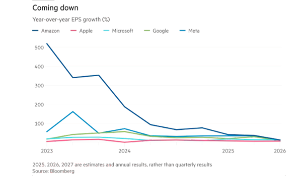 Cuando se trata de ganancias de IA, la situación es aún peor. Los resultados de crecimiento de las ganancias anuales de las grandes tecnológicas se han estancado o ralentizado durante los últimos trimestres y se espera que disminuyan aún más en 2025 y 2026.