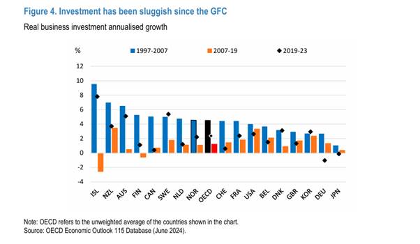 El factor clave para aumentar la productividad laboral es la inversión en nueva tecnología que ahorre mano de obra. Pero la inversión empresarial se ha ralentizado notablemente en todos los países. Y la OCDE deja claro por qué. La «desaceleración de la inversión a pesar del crédito fácilmente disponible y barato para las empresas con acceso a los mercados de capitales está en línea con los patrones históricos que muestran que la incertidumbre y las ganancias esperadas tienden a desempeñar un papel más importante que las condiciones financieras en las decisiones de inversión». En otras palabras, la rentabilidad del capital disminuyó, reduciendo el incentivo para invertir en nuevas tecnologías.