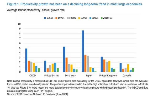 El crecimiento de la productividad laboral ha tenido una tendencia a la baja desde la década de 1970 en toda la OCDE y se ha debilitado aún más desde el cambio de siglo. En los Estados Unidos, la productividad aumentó desde mediados de la década de 1990 hasta mediados de la década de 2000 debida al aumento de la eficiencia en la producción de equipos de TIC y a la difusión de innovaciones relacionadas con Internet que se adoptaron en los sectores que utilizan las TIC, en particular el comercio minorista. «Sin embargo, este rebote fue relativamente efímero y el crecimiento de la productividad ha sido mediocre desde entonces».