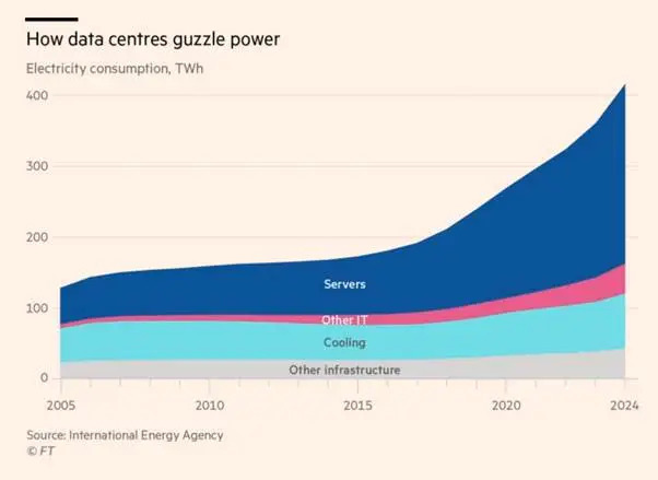 Mientras tanto, la construcción masiva de centros de datos consume niveles de energía sin precedentes. La Agencia Internacional de Energía predice que el consumo de electricidad del centro de datos se duplicará a 945 teravatios-hora para 2030, más que la energía utilizada actualmente por un país entero como Japón. Irlanda y los Países Bajos ya han restringido el desarrollo de nuevos centros de datos debido a preocupaciones sobre su impacto en la red eléctrica. Hay enormes aumentos en la demanda de energía en los centros de datos en los modelos de IA de entrenamiento, junto con un suministro de energía renovable lleno de baches que amenaza la resiliencia y la capacidad de los sistemas energéticos actuales.