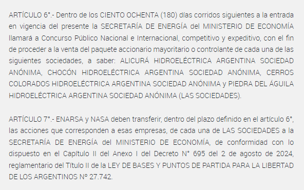 En el boletín oficial del 19 de Agosto de 2024, estrenando la Ley Bases se publica la Concesión y venta del paquete accionario de cuatro empresas hidroeléctricas del sur.